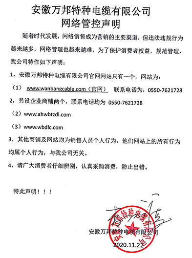 鄭重聲明:安徽萬邦特種電纜有限公司官方網站為:www_wanbangcable_com.dao120.cn,除此之外無任何子網站或合作網站,其余均為假冒偽劣。電話:0550-7621728 13485756353 地 址:安徽省天長市滁州高新技術產業開發區經四路29號